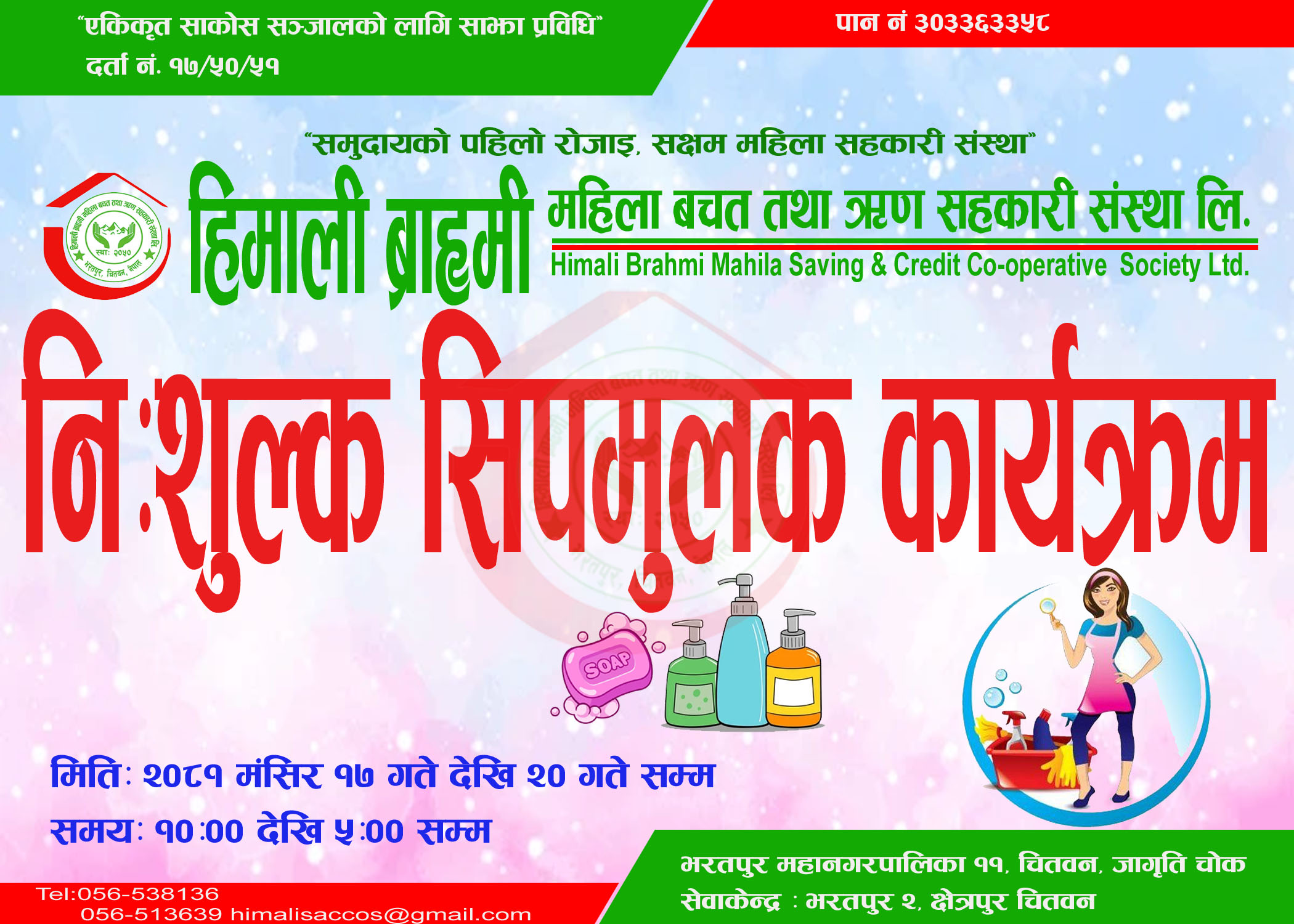 मिति २०८१ मंसिर १७ गते देखि २० गते सम्म निशुल्क सिपमुलक तालिम (भाडा माझ्ने , फिनेल , लुगा धुने, पिताम्बर) गरी अन्य धेरै थरि सामग्री निर्माण तालिम संचालन हुन गइरहेकोले तथा सिट जम्मा ४० जनाको रहेकोले समयमै नाम दर्ता गरी आफ्नों सिट सुनिश्चित गर्नुहुन अनुरोध गर्दछौ l साथै नामदर्ता गर्दा १००० बुझाउनु पर्नेछ जुन रकम कार्येक्रम समापनको दिन फिर्ता हुनेछ l